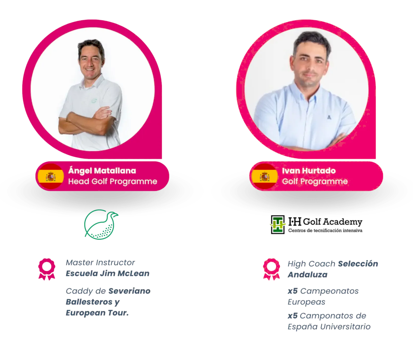 Muchos de ellos han trabajado en los niveles más altos del golf amateur y profesional, habiendo conseguido, entre otros, 3 campeonatos nacionales de España de profesionales, lo que les permite transmitir a los estudiantes un conocimiento profundo tanto de la técnica como de la mentalidad necesaria para competir.